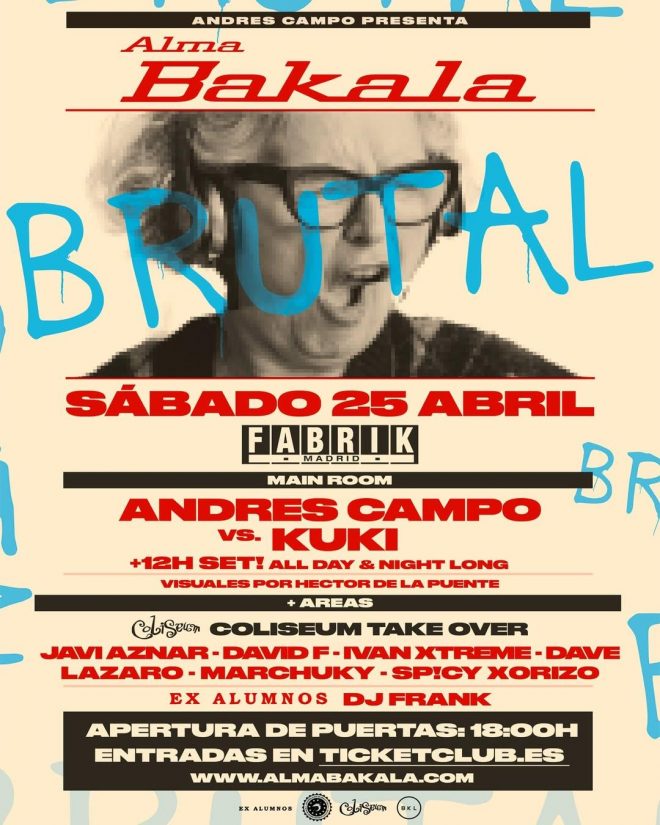 El próximo Sábado 25 de abril, el club Fabrik acogerá una nueva edición de Alma Bakala, el proyecto con el que Andrés Campo revisita su historia en cabina desde una perspectiva actual. Lo hará en el formato que mejor define la esencia del concepto: un all night long de 12 horas, de 18:00 a 06:00, en el que el artista firmará una sesión maratónica sin interrupciones.